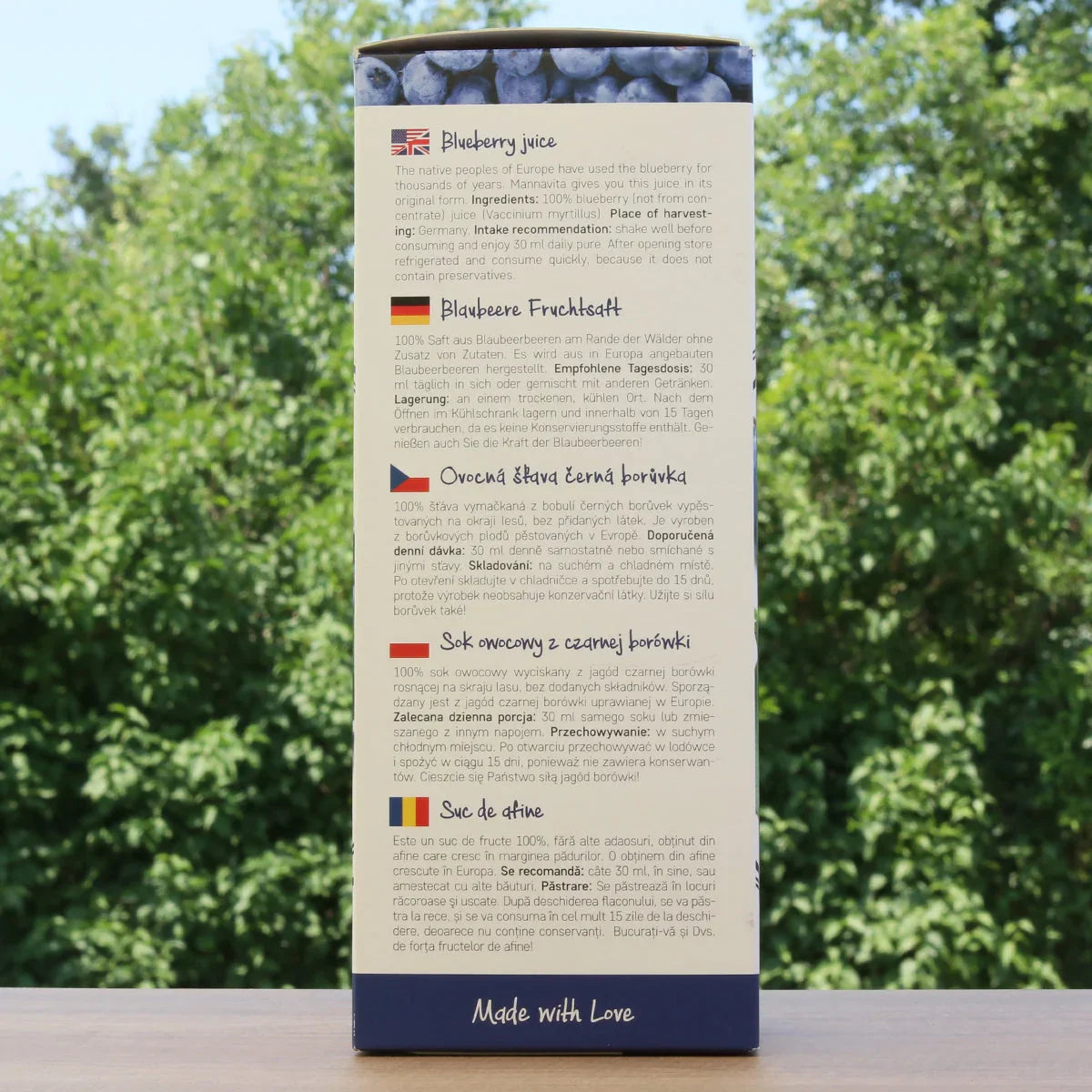Mannavita 100% Blåbärsjuice är en direktjuice tillverkad av svarta blåbär (Vaccinium myrtillus) odlade vid skogsbrynet.