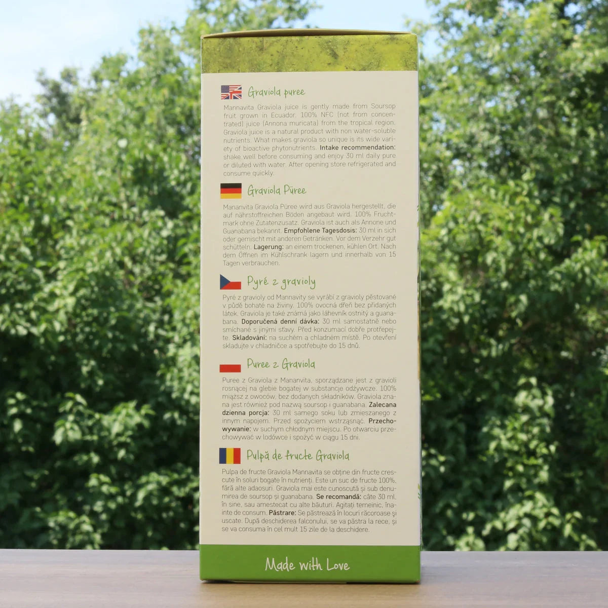 Mannavita graviola-fruktpuré är ett 100 % fruktpuré, traditionellt tillagad. Den innehåller inga tillsatta ämnen eller konserveringsmedel, så efter öppning bör den förvaras i kylskåp och konsumeras inom 15 dagar.