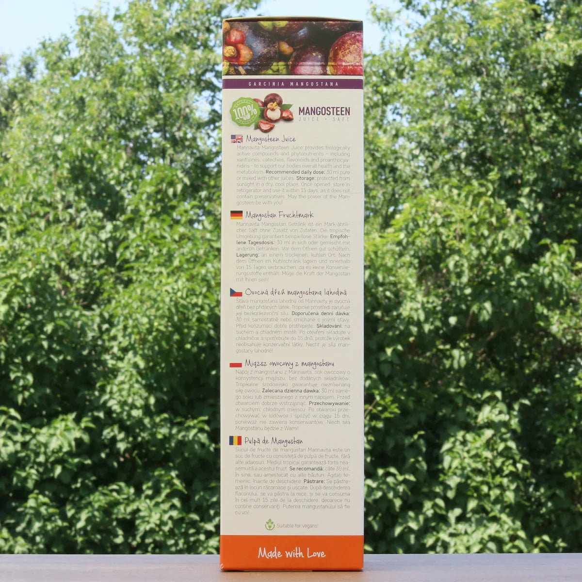 Mannavita Mangosteen pulp, en 100% puréliknande dryck, tillverkas av riktig mangostanfrukt med en skonsam process. Inga tillsatser eller konserveringsmedel ingår, så efter öppning måste den förvaras i kylskåp och konsumeras inom 2 veckor.